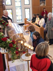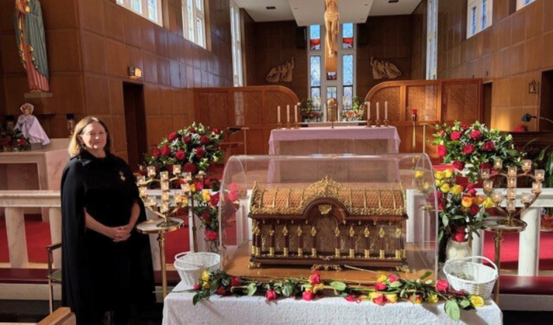 Missouri Area members served as Honor Guards for the relics of St. Thérèse of Lisieux. At the invitation of the Provincial Superior of the Carmelite Sisters of the Divine Heart of Jesus, 16 Knights and Dames stood watch on the night of November 9 and throughout December 10 beside a reliquary containing some of the saint’s bones while it lay in response at St. Agnes Home in St. Louis. Order of Malta members are regular visitors to St. Agnes home, where they have often assisted with bingo games for the residents and joined them and the sisters for mass in the chapel where they now stood vigil.