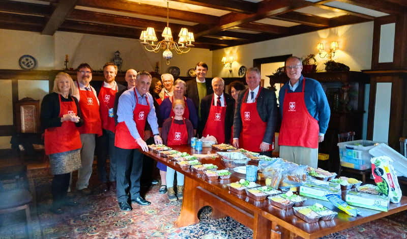 Following the liturgy, Knights and Dames convened for a business meeting to discuss emerging topics and upcoming events for the new year. Our guests joyfully joined us afterward as we prepared monthly meals for shut‑ins—this time with a festive holiday twist. In addition to the meals, each person contributed homemade cookies, allowing us to assemble a delightful cookie tray for the beloved recipients of our outreach.