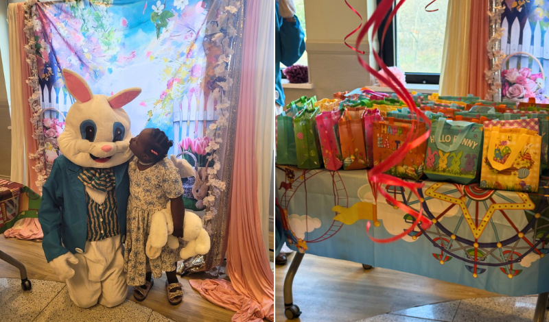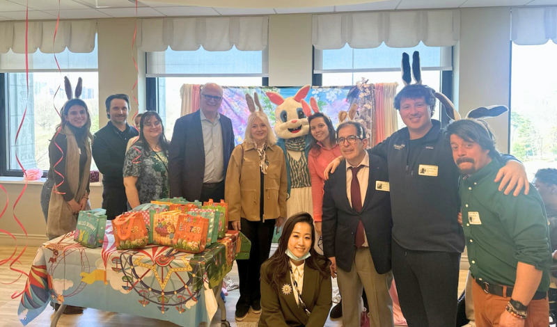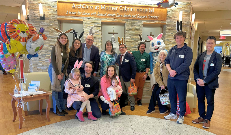 On Palm Sunday, the Easter Bunny and volunteers from the NYC Area made an early Easter visit to the children and young adults of Mother Cabrini Specialty Hospital in East Harlem. Our volunteers prepared festive Easter bags filled with colorful eggs (each with small toys inside) and other treats for every resident. Then, led by the Easter Bunny, the volunteers gathered with a large group of the residents in the lounge area to hand out the bags, share smiles, and spend time playing together as cheerful tunes like Here Comes Peter Cottontail filled the room.